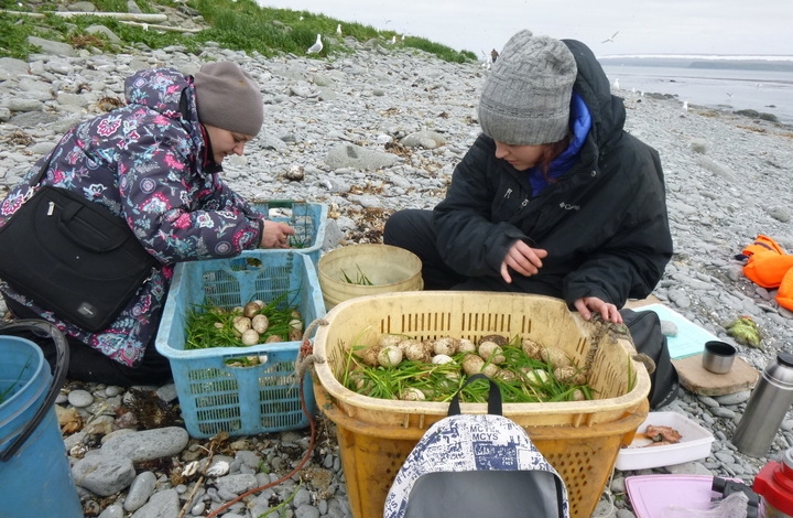 Сбор проводился на острове Топорков, где выводит потомство 45000 пар пернатых. За яйцами ходили дважды, чтобы не волновать гнездящихся попугаев, – в первый день было собрано 532 яйца, а во второй, спустя неделю, – 562. Сбор был разрешён только в буферной прибрежной зоне. Для добычи яиц сборщики использовали защитные рукавицы. Яйца вынимали прямо из нор, где гнездятся топорки, и аккуратно складывали в корзины слой за слоем, а между слоями яиц выстилали траву – чтобы не разбить ценный груз. По совету старожилов, если хотите, чтобы топорок отдал вам яйцо сам, нужно в норе попытаться поймать саму птицу. Тогда она отступает назад и выталкивает вперёд яйцо. Так делали старики-алеуты.